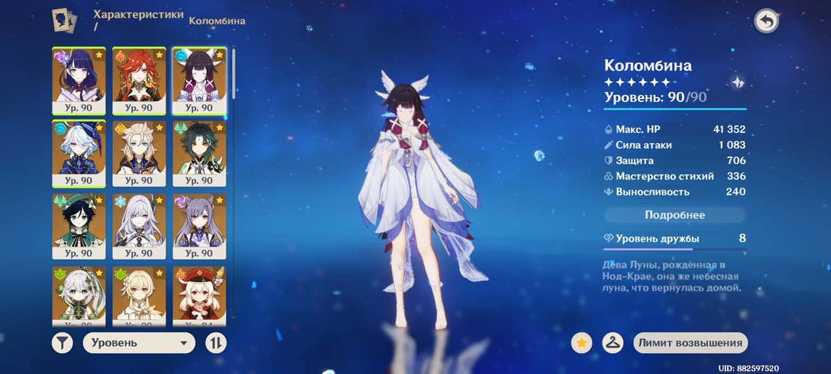 📈 Ранг: 60 🧍♀️ Персонажи: Арлекино, Чжун Ли, Е Лань, Нёвиллет и другие ✨ Примогемы: 43