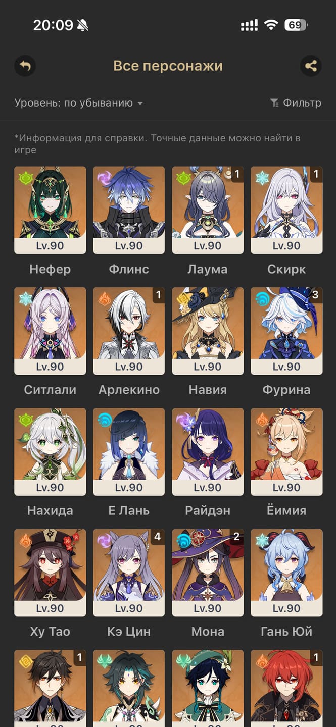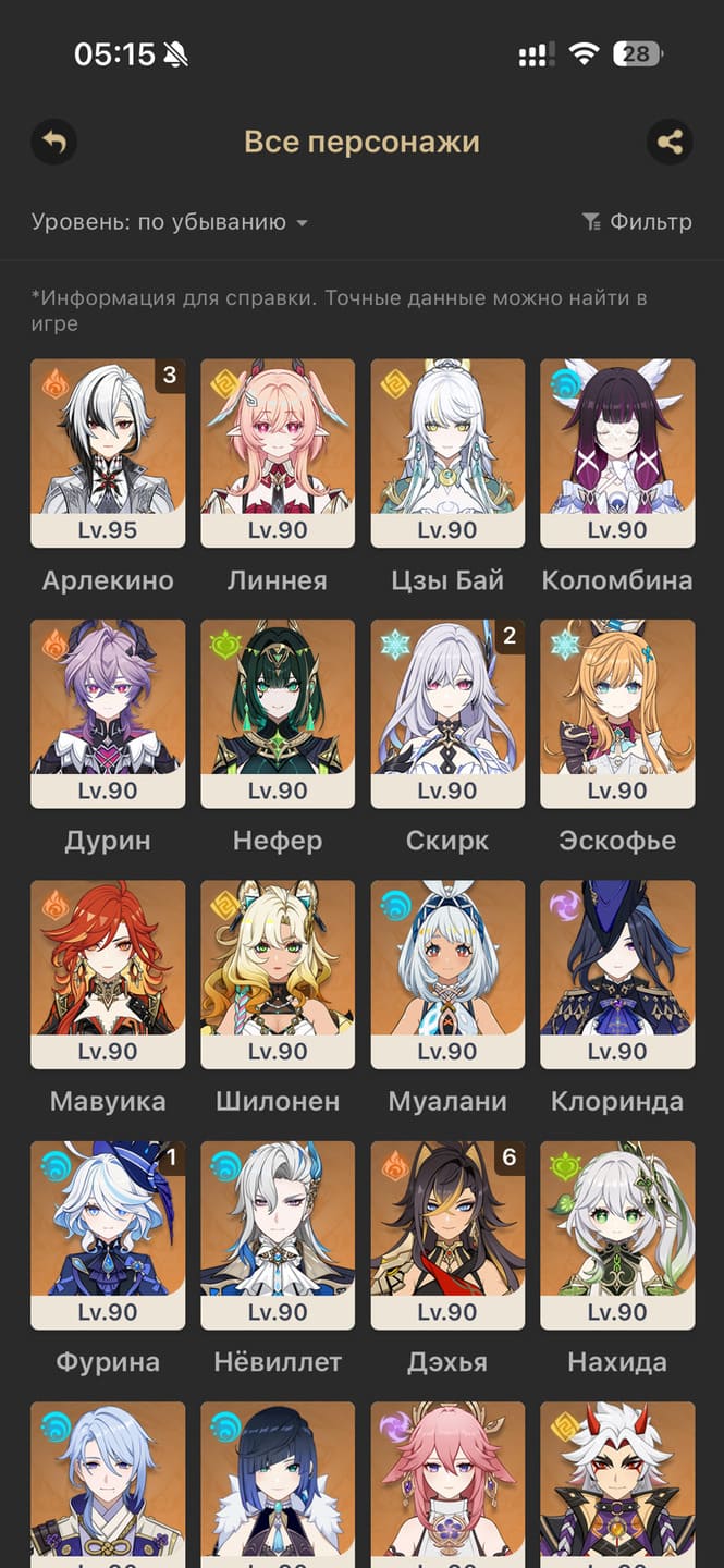 📈 Ранг: 58 🧍♀️ Персонажи: Арлекино, Нахида, Тигнари и другие ✨ Примогемы: 484