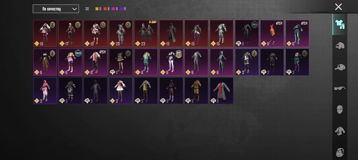 👚Топ костюмы: 31; ⭐️Royale Pass: с 6 сезонна; 🌈Скины на оружие: 36;