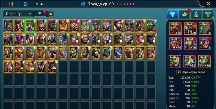 ⚡Уровень: 100 🔥Количество героев:: 287 💪Сила: 13,47 млн